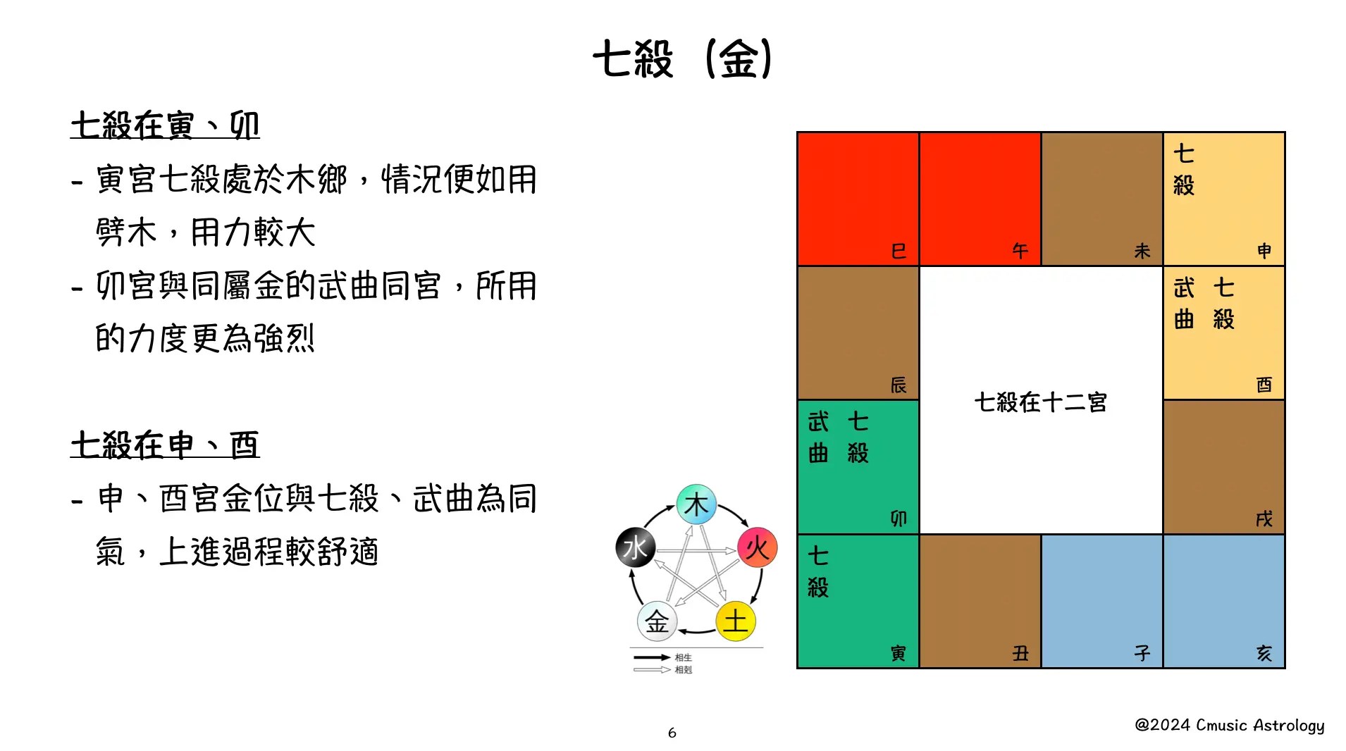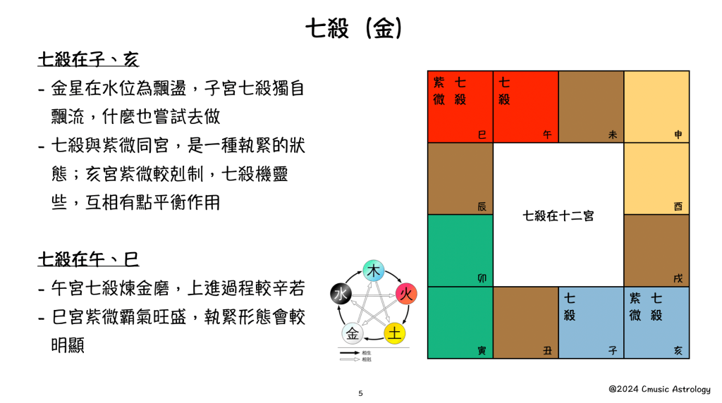 在紫微斗數中所扮演的角色,紫微星系代表「在朝」,天府星系代表「在野」,每顆星曜落入不同五行宮位會如何出現不同的形態。例如「七殺」在午即金星進入火位,形成一種火鍊金磨狀態;「七殺」在申宮即金星進入金位,亦稱之謂「同氣」,這顆七殺便相對較為安逸。
